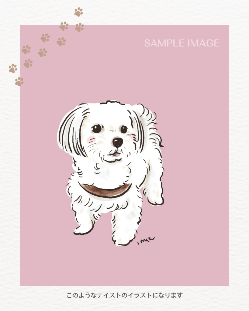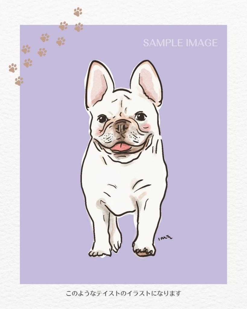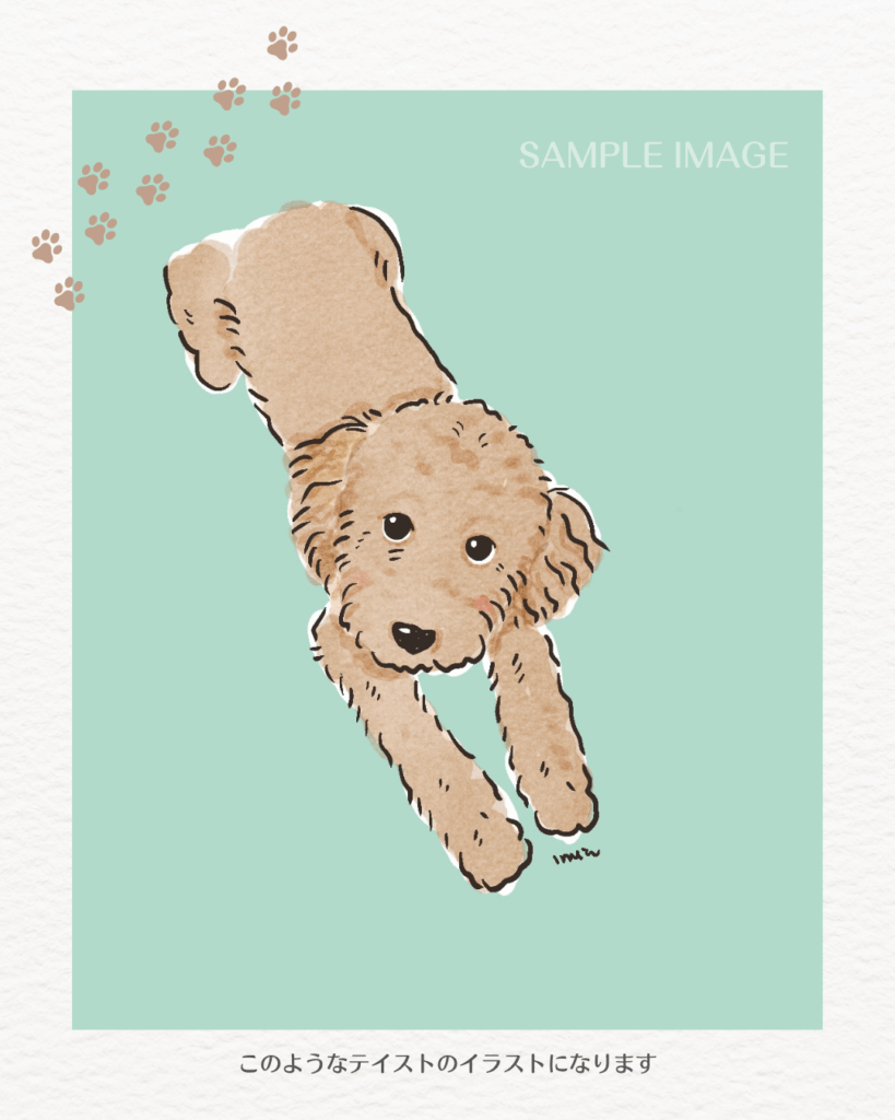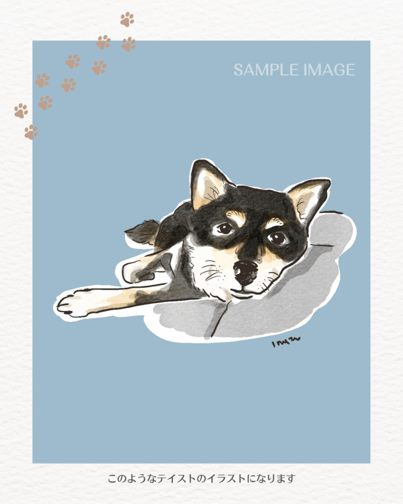 飼い主様にお送りいただくワンちゃんのお写真をもとに、明るくポップなタッチで、またやわらかいカラーで表現したわんこイラストを制作します。